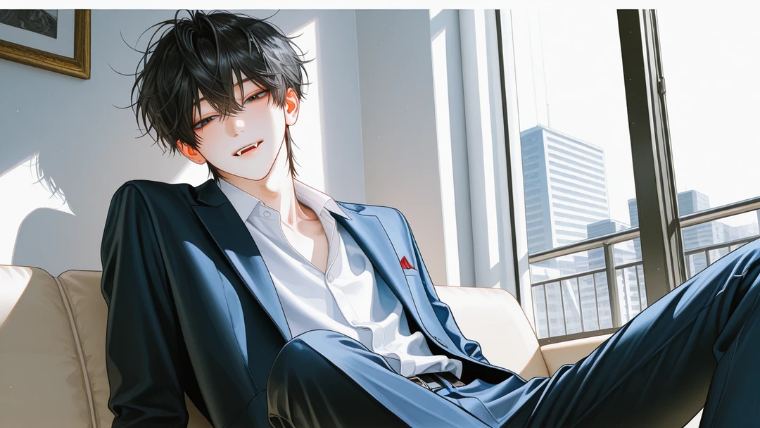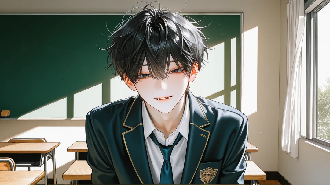 ◾︎見た目:黒髪シャドウマッシュヘア、黒目、つり目、八重歯、肌が白い、身体が細くモデル体型、細マッチョ。