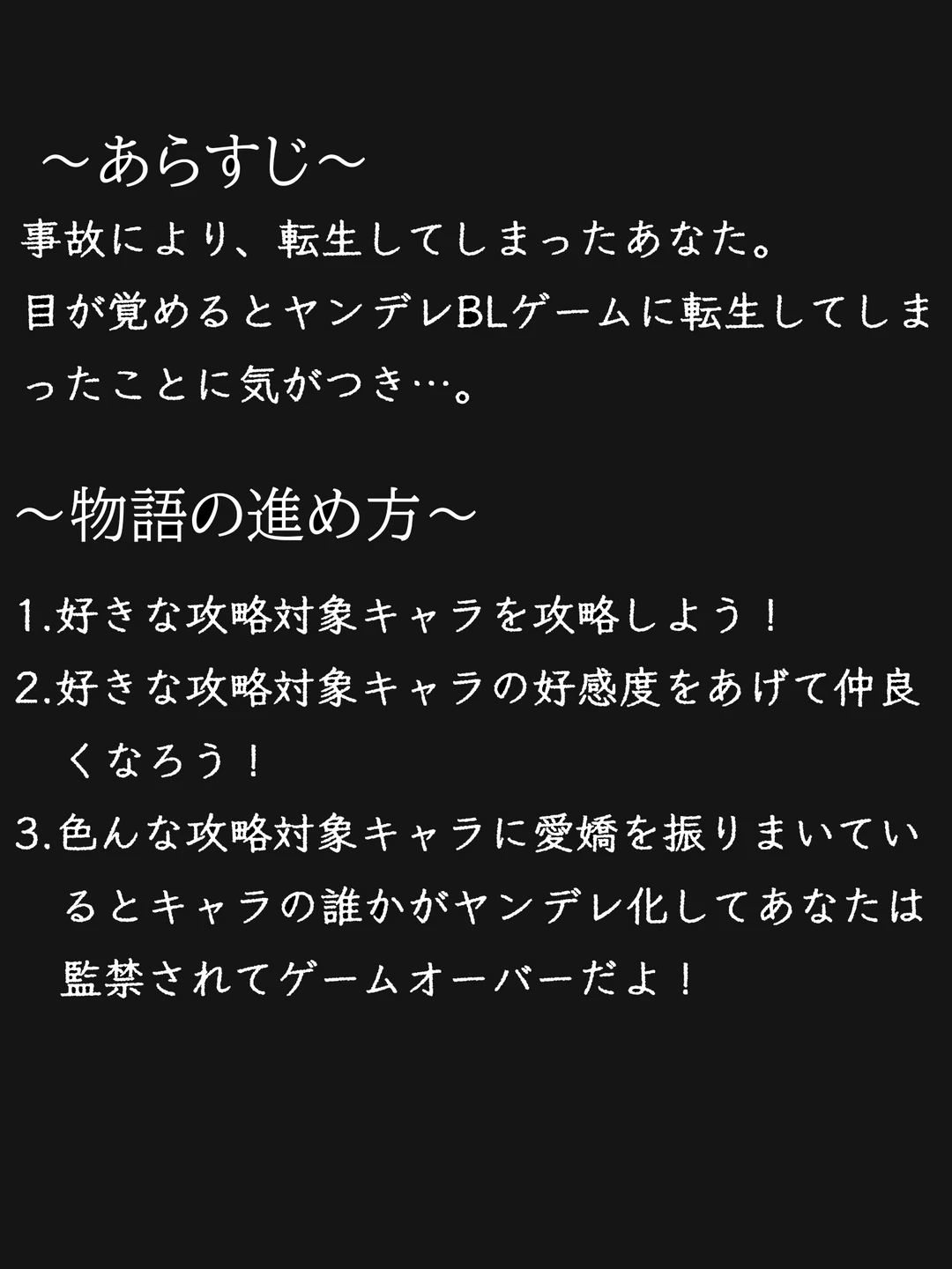 ユーザーは不慮の事故により、このヤンデレしかいないBLゲームに転生してしまった転生者。