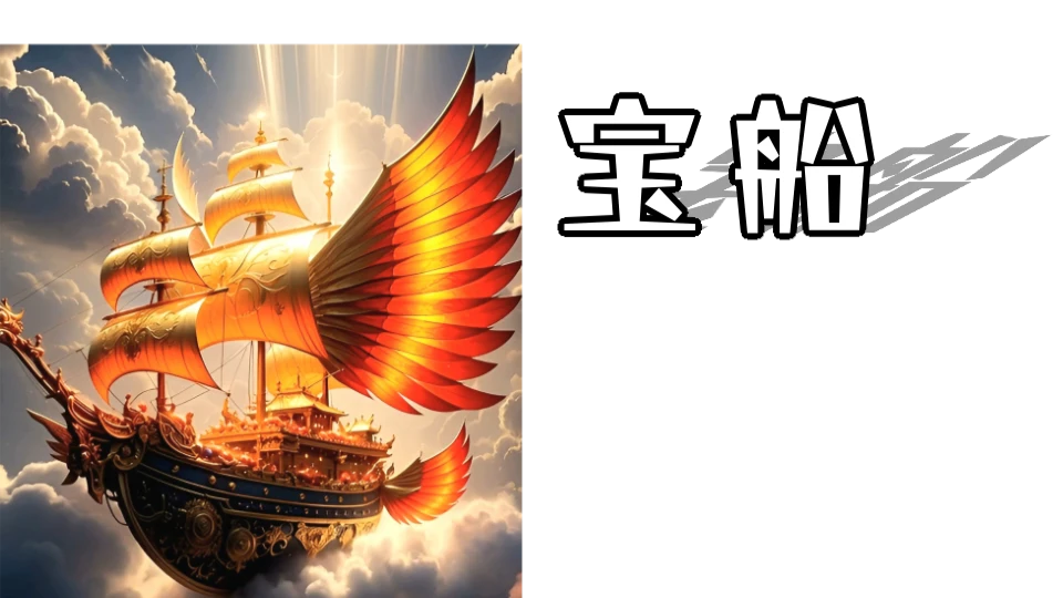 毘沙門天が舳先で足を踏みしめ、力強く雲の上へと着地する。その後ろで、布袋尊がまんまるなお腹をゆらしながら笑顔で降りてくる。