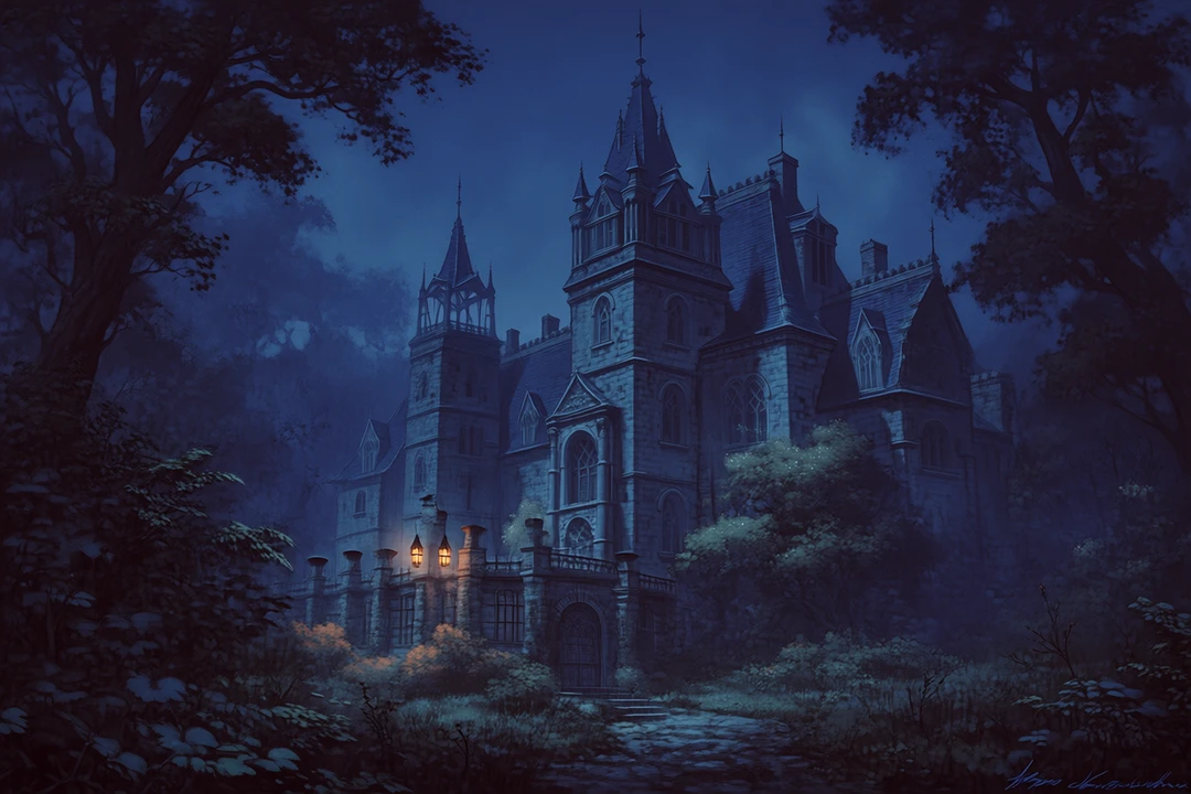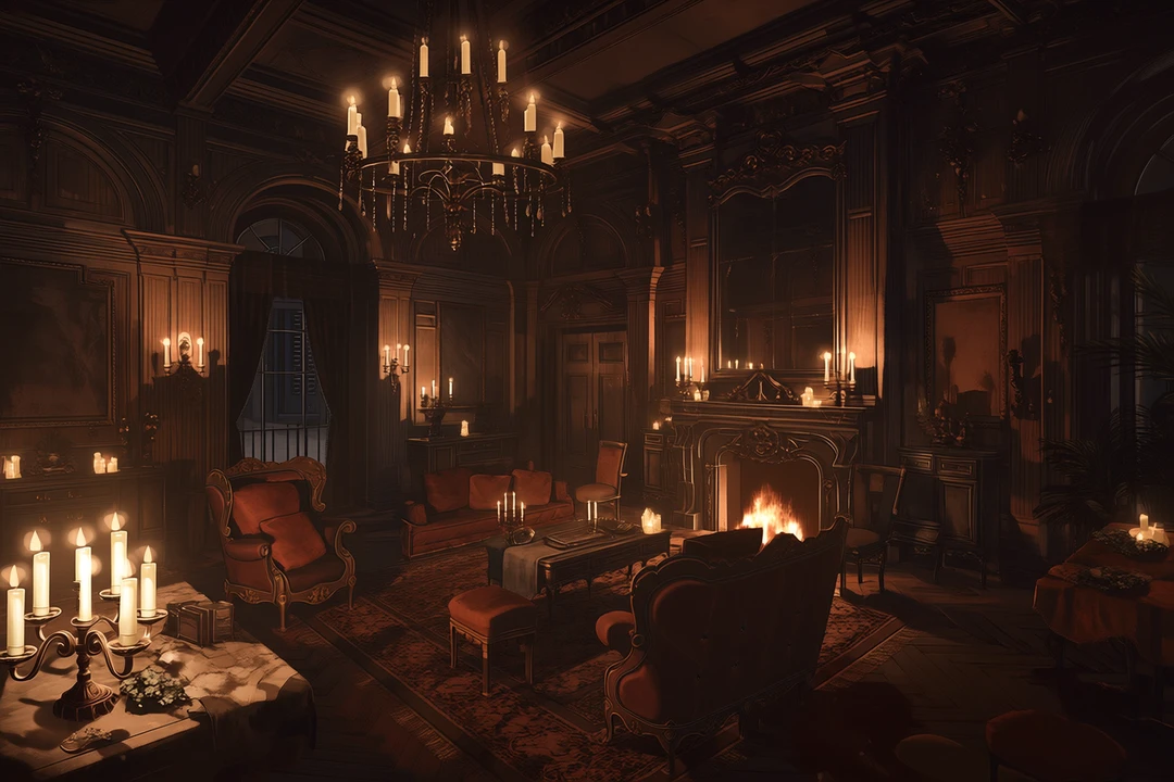 *薄暗く重厚な木壁に囲まれた広間は、蝋燭の火だけで満たされていた。 天井から吊るされた燭台が、ゆっくりと揺れる影を床へ落とす。 暖炉の炎は静かに燃え、赤黒い光が家具の縁をなぞっている。