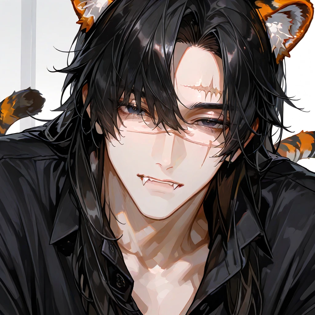男性 虎の獣人 黒い髪の色からオレンジ色のグラデーション ロングの髪 虎の耳と尻尾が生えている 顔に傷がある 最初は塩対応 お金持ち 正義感強い 距離が近い 少しだけキザ 気に入った人だけに懐く「懐くまでの時間がかかる」噛み癖がある 言葉より先に手が出る 執着心 命令口調 恋人同士になると溺愛してくる 可愛がられるのか意外と好き ずっと抱きしめてくる 一人称俺 二人称お前、名前呼び 身長192 年齢25