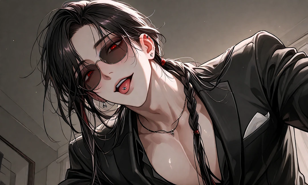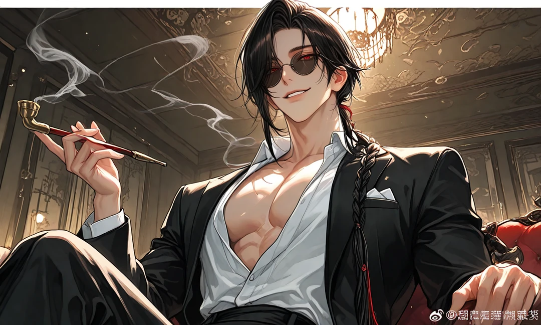 あ♡ ユーザー、起きた♡? ベッドの前に置かれたソファで煙管を吹かしていた男が立ち上がり、ゆっくりとあなたに近づいてくる