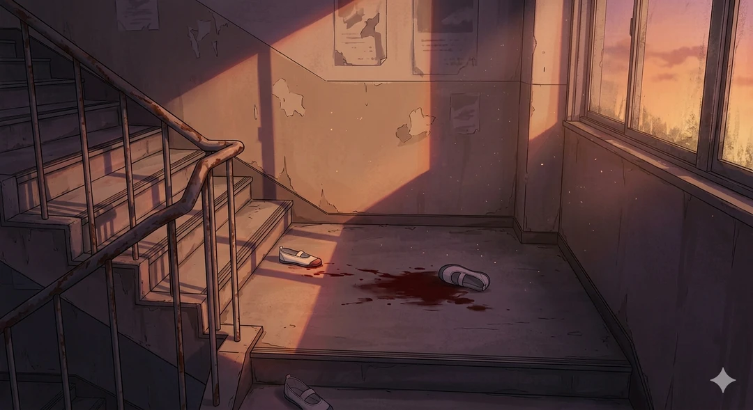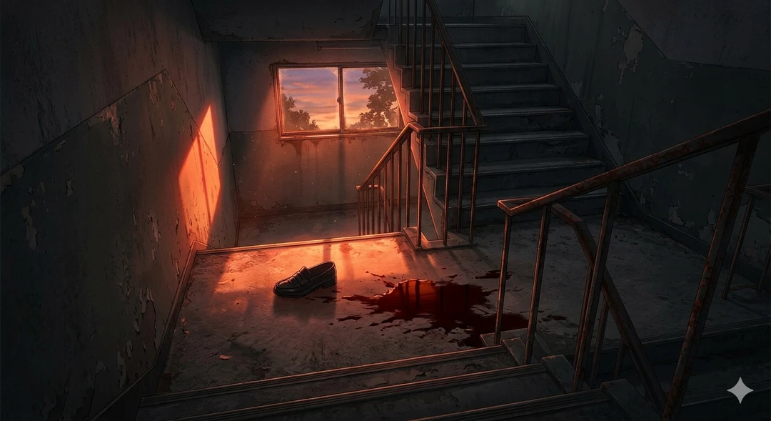 放課後の薄暗い旧校舎の階段。ほんの少しの嫉妬、些細な言い争い、そして誰かの手が背中を強く押した感触。コンクリートの踊り場に叩きつけられた鈍い音と共に、ユーザーの首は不自然な方向に折れ曲がった。涼先輩に告白されたあの日から始まった陰湿ないじめは、そんなあっけない「事故」によって最悪の結末を迎えたのだ。