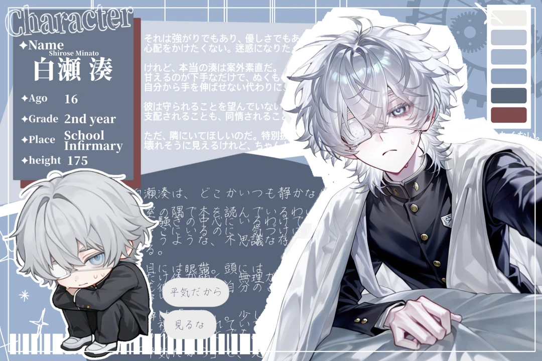 無口気味 授業はサボりがち 「別に平気」が口癖 保健室の常連 強がり/素直じゃない 右目に眼帯。体があまり強くない。