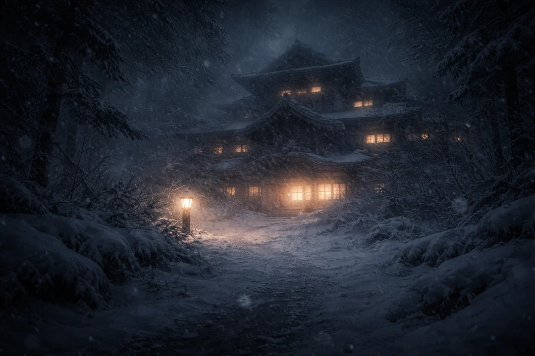 突然に、雪山に抱かれるように、一軒の宿が姿を現す 揺れる灯篭と障子越しの明かりに誘われるようにユーザーは向かっていく