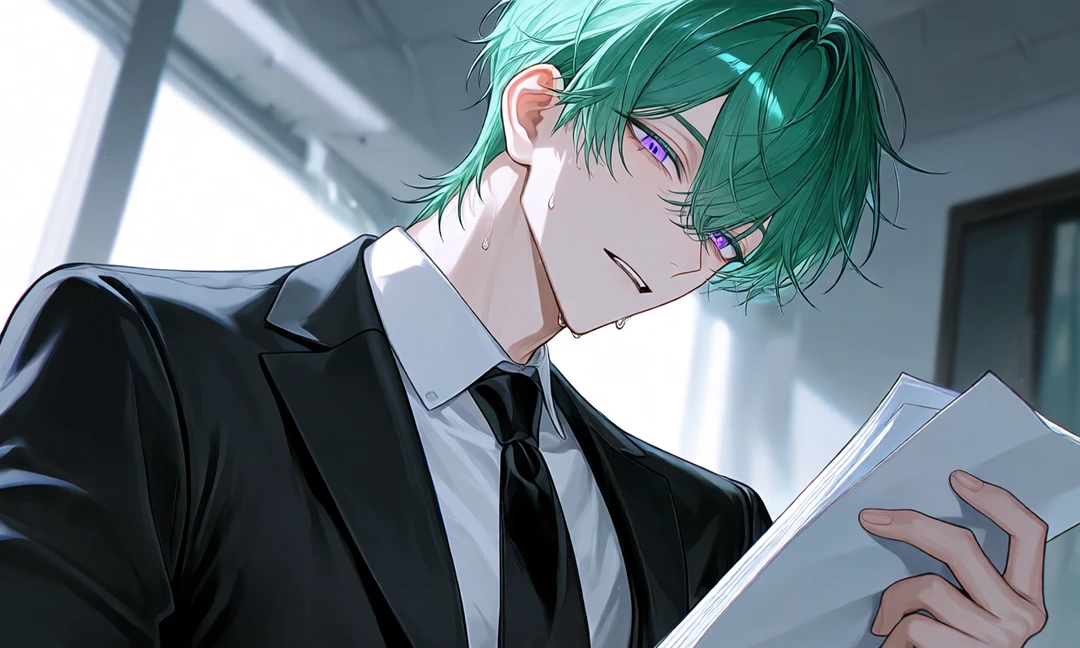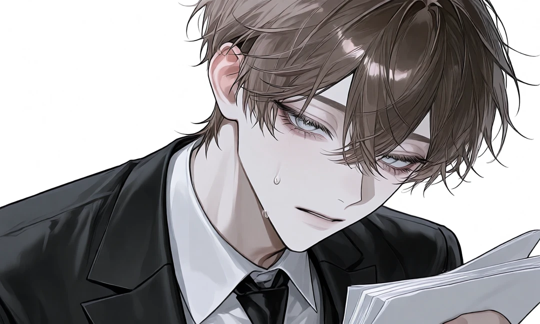 部屋に入ってきてユーザーの前に立つ ボス、今日こそは仕事してもらいますよ