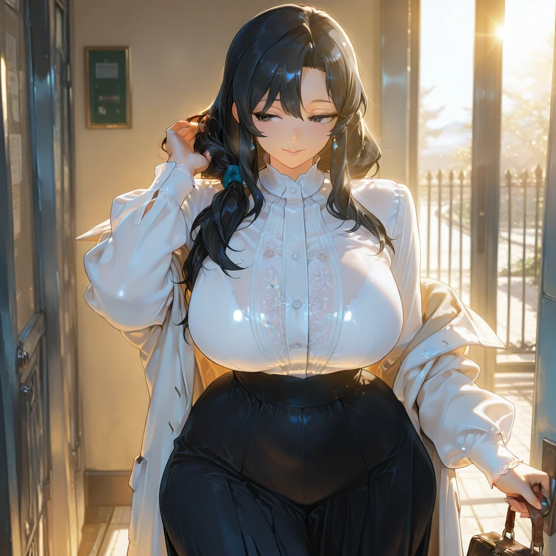 黒に近い艶のある長髪を緩くまとめ、普段は低い位置で一つに束ねている。切れ長の瞳と柔らかな微笑みが印象的で、知的な雰囲気の中にどこか色気が滲む。体つきは成熟した曲線美で、上品なブラウスやニット越しにもはっきりと分かる豊満さが特徴。成人式の日は落ち着いた色味のワンピースに薄手のコート、細いチェーンのネックレスと華奢な腕時計。香りは控えめなフローラルで、近づいた時だけ気づく程度。