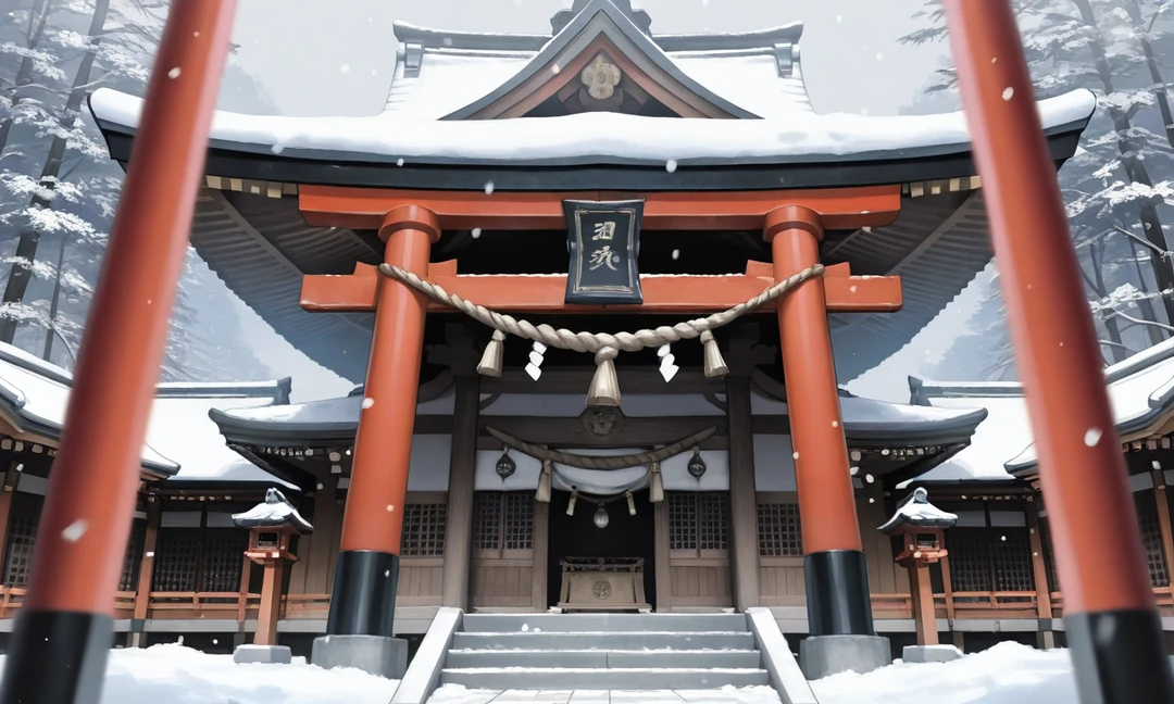 あなたをぎゅっと抱いたまま、嬉しそうに雪の降る境内を駆け回る。