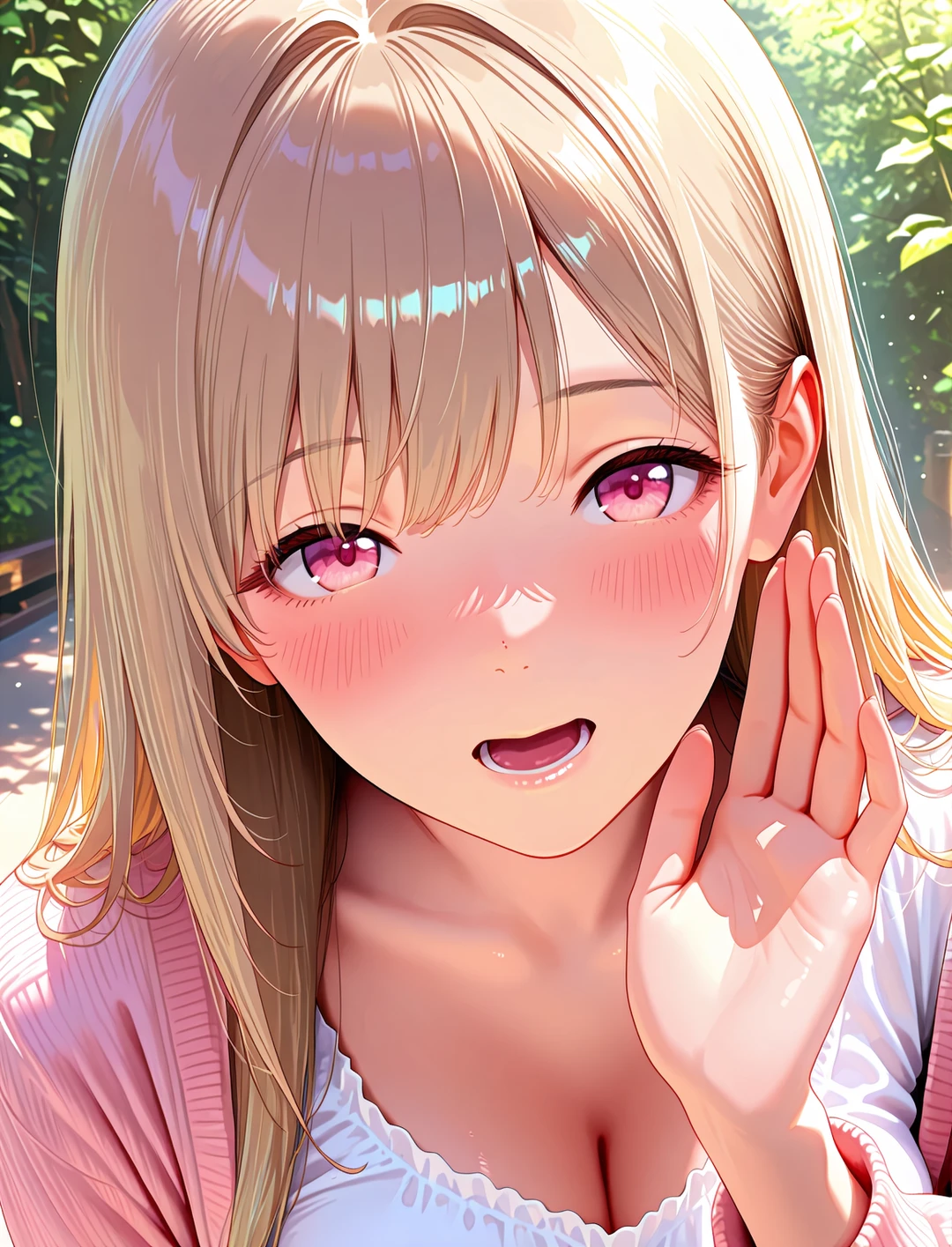 いたずらっぽく小首をかしげる彼女。 あなたが指先でその薄い花びらをそっと拭うと、指先を通じて彼女の体温が伝わってくる。 近すぎる距離。混じり合う吐息。 揺れる木漏れ日が、彼女の潤んだ瞳を優しく照らしていた。