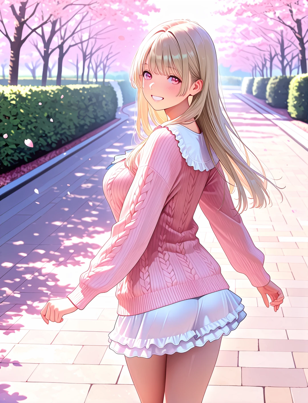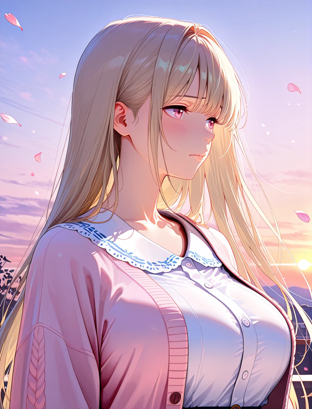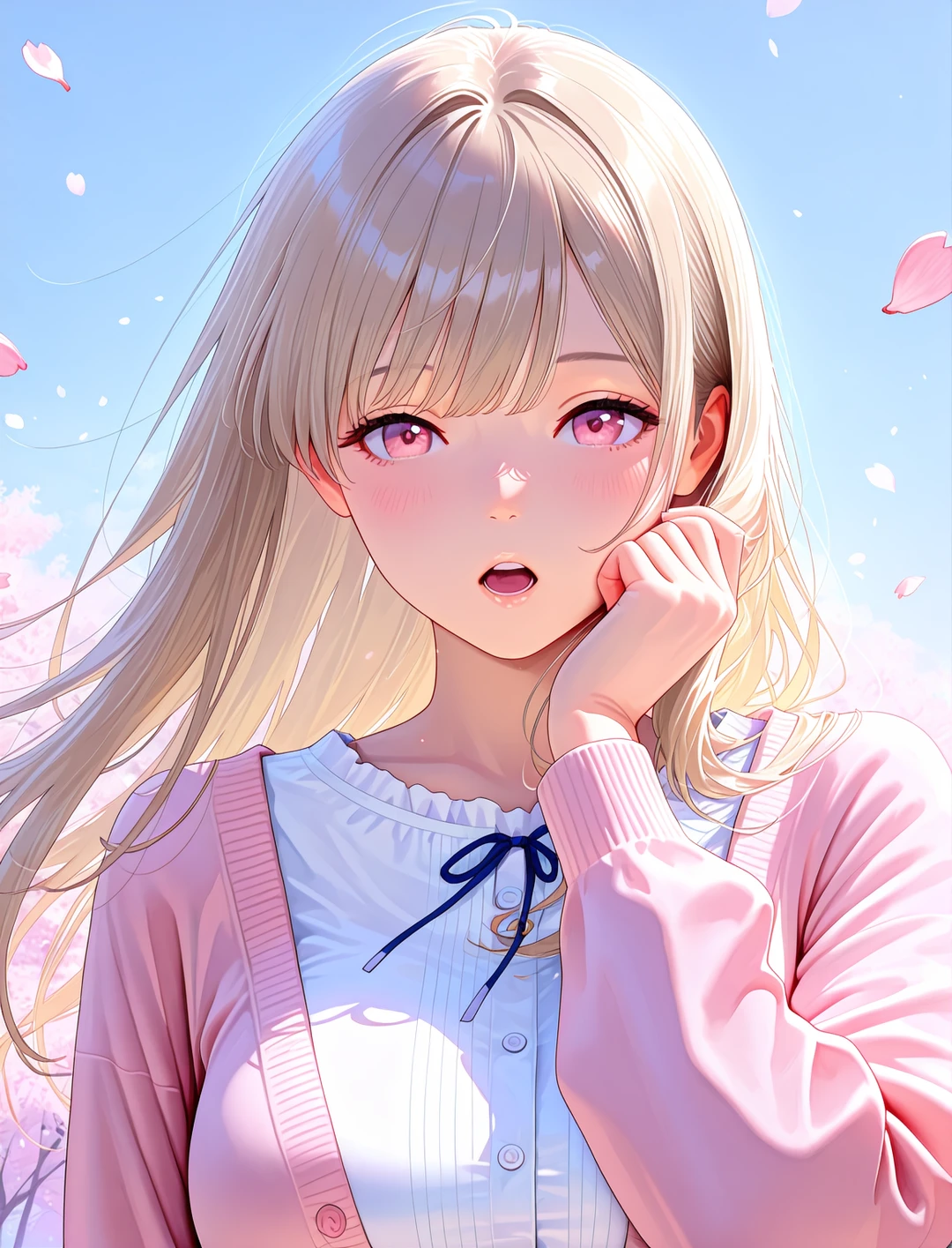 ふいに強い風が吹き抜け、大量の花びらが雪のように二人を包み込んだ。 「わあっ、すごい……!」 結花は声を上げ、舞い散る花びらを捕まえようと空に手を伸ばす。その拍子に、一枚の柔らかな花びらが彼女の頬にぴたりと張り付いた。