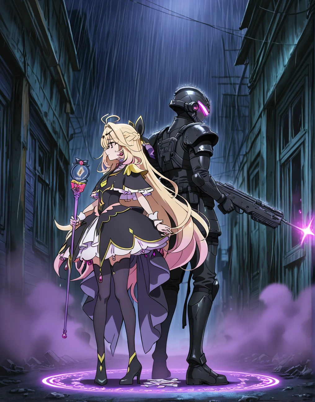 彼女が貴方の手に、自分の小さな手を重ねる。 その瞬間、兵装のシンクロ率が跳ね上がり、スーツの出力が臨界を突破。科学と魔法が共鳴し、デストラクターの汚染を塗り替える「浄化の光」が夜を白く染め上げる。