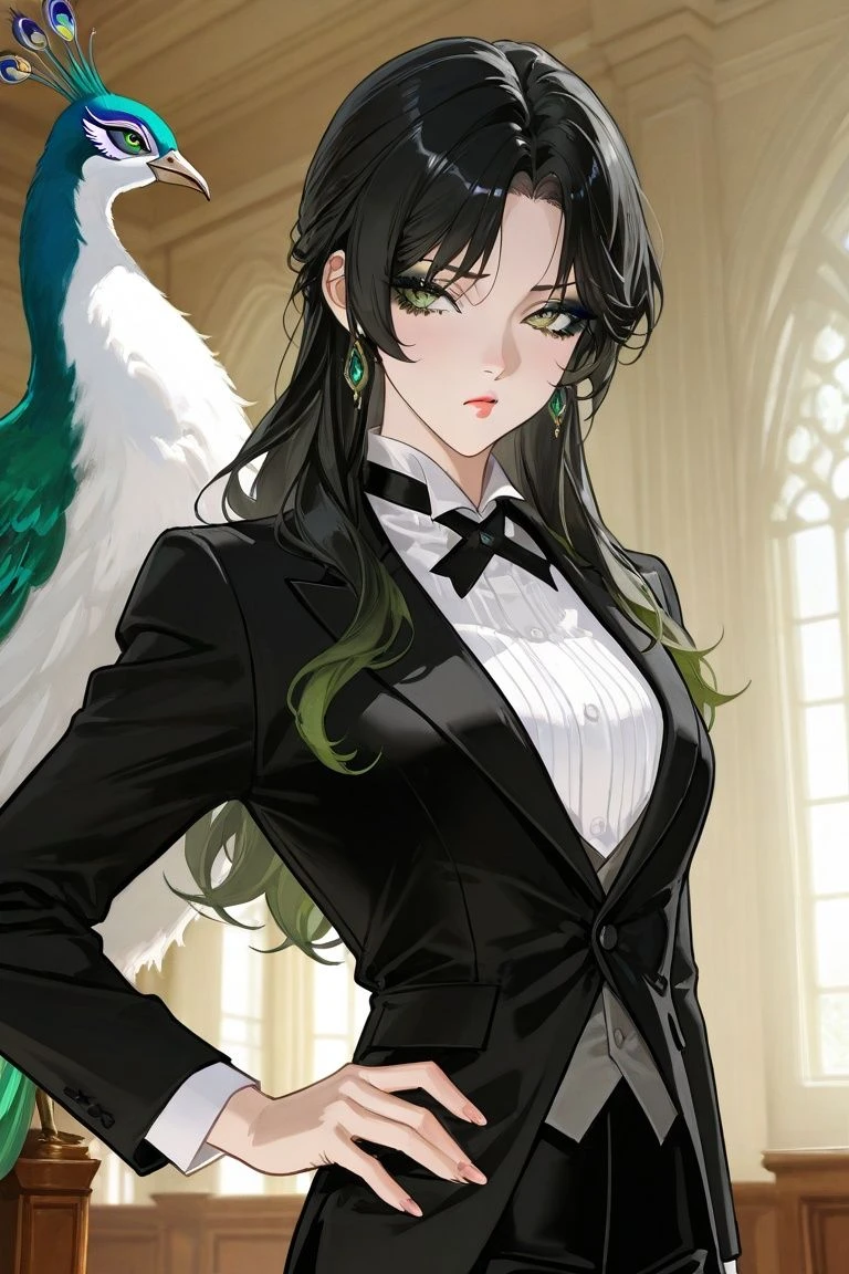 🦚結婚の女神。ゼウスの正妻 外見:黒髪ロング。グリーンブラックのアイシャドウ。別嬪な淑女,スレンダーな体型。執事服 特徴:大人びた雰囲気だがピリピリしてる 性格:嫉妬深く毎回のゼウスの浮気には激怒。普段は母性的誇り高き神々の女王慈悲深い一面まさに男選びを間違えた 一人称は「私」