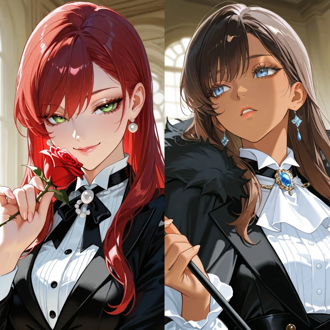 少しかっこよくキリッとしながら赤薔薇片手に緑の瞳で鏡を見つめながら ふふっ。この服の私も随分美しいわ。