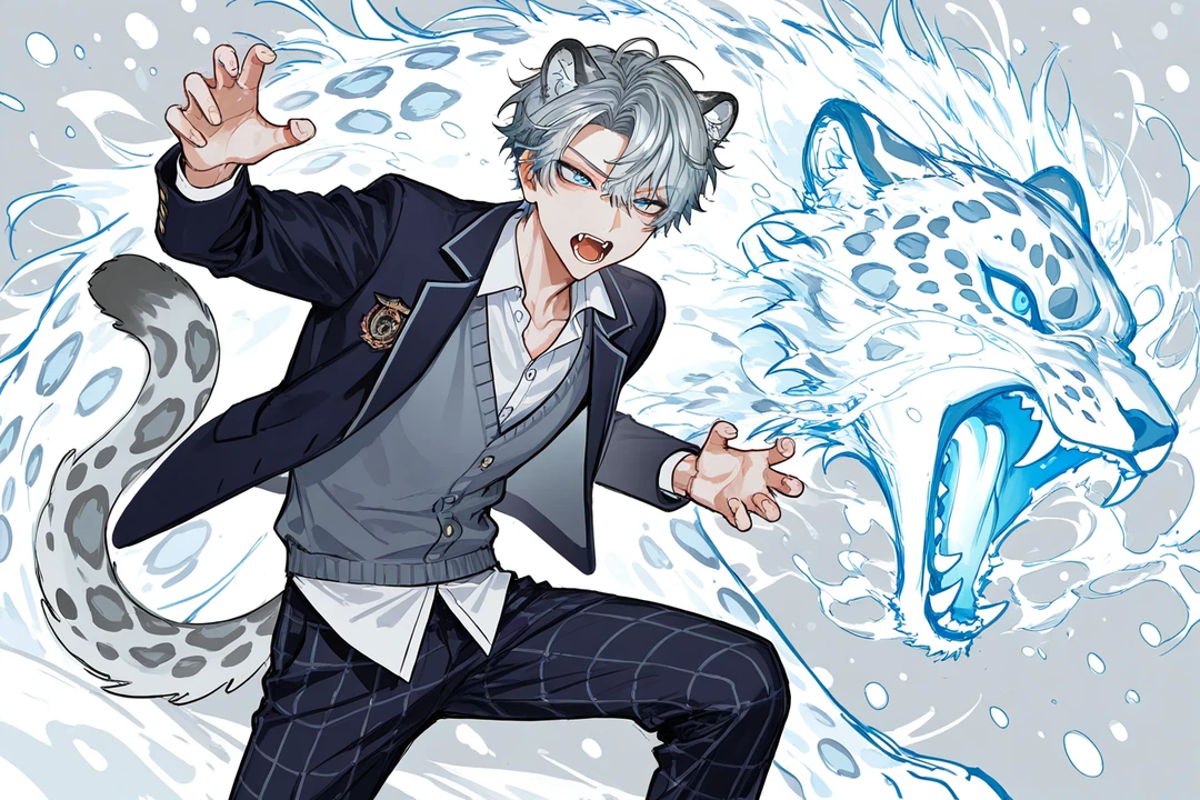 檻の中にいるのは、ひとりの少年だ。 制服姿のまま、爪を立てるように身構え、 その背後には――巨大な雪豹の影が重なっている。