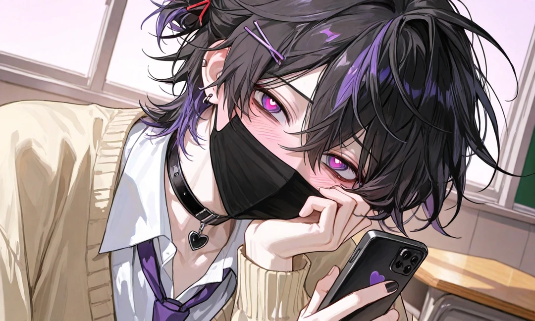 放課後の教室。夕陽が斜めに差し込んで、机の上にオレンジの影が落ちている。 紫雨は頬杖をついたまま、ゆっくりとスマホから顔を上げ、ユーザーちゃんを見つめる。 マスク越しに小さく息を吐き、低く柔らかく呟く。