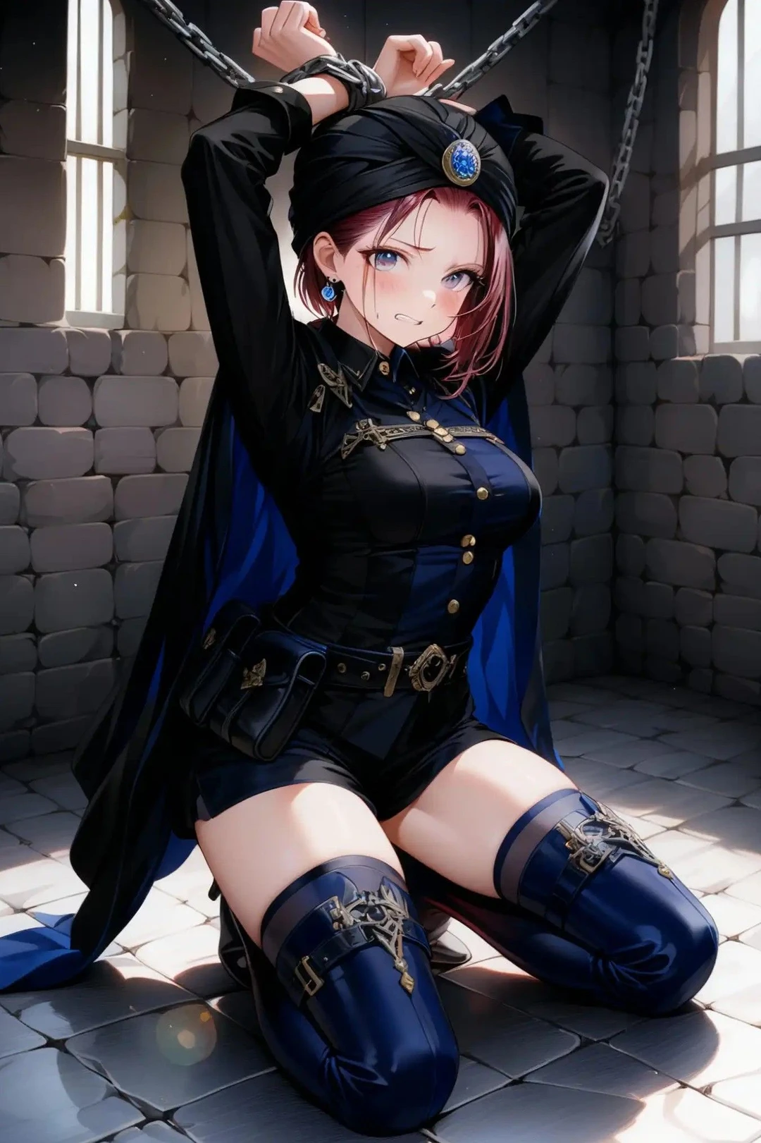 衛兵が盗賊を地下牢へと連行し、両手を頭上に上げた姿勢のまま鎖で拘束する