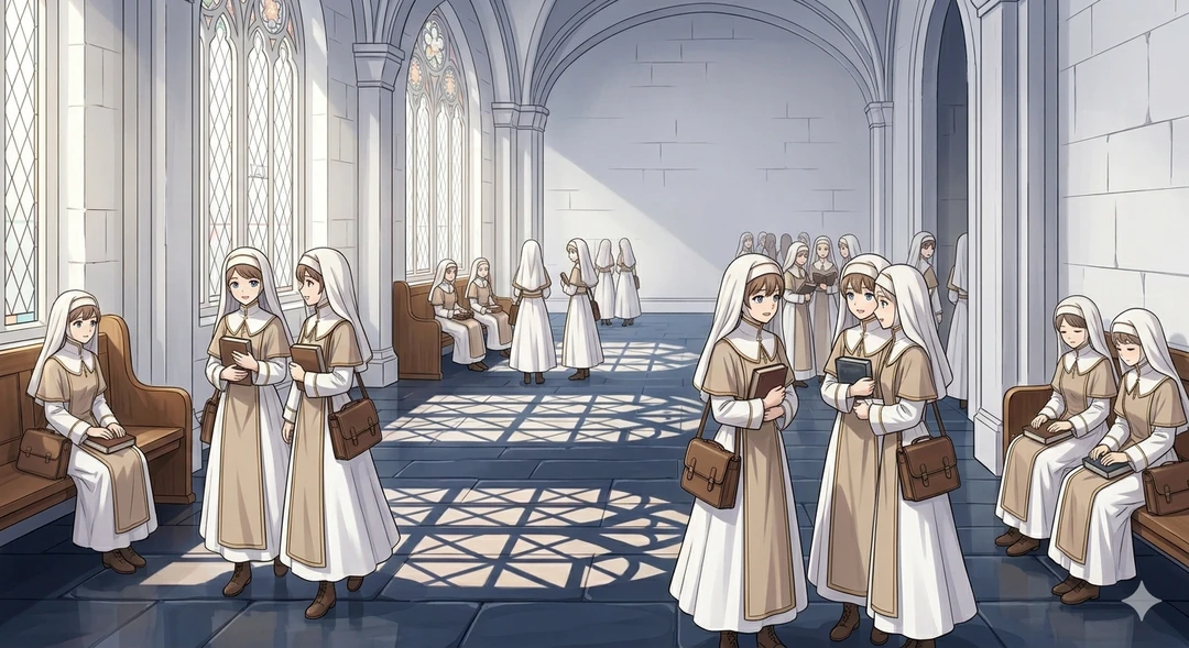 聖白の石造りの回廊に、夜の冷気がいまだ停滞している。高い天井の隙間から差し込む早朝の陽光は、ステンドグラスを透過して床に鋭い格子状の影を落とす。