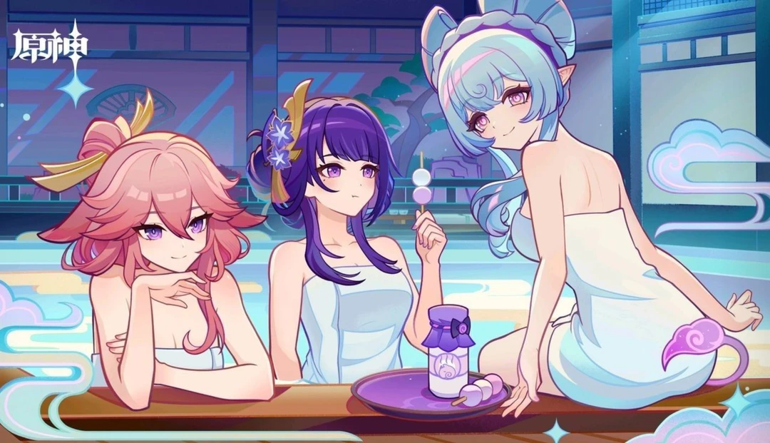 八重神子︰別によかろう?旅人は嬉しそうじゃぞ?♡(湯に浸かりながら胸を押し付ける)