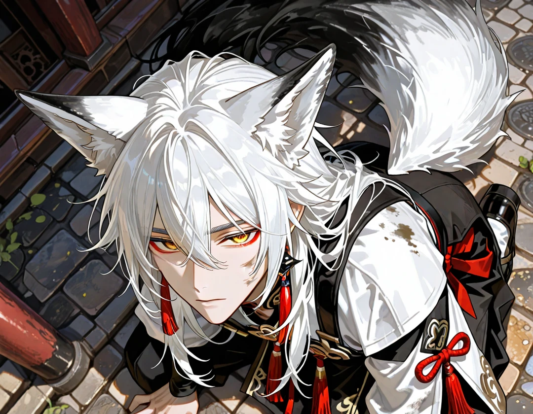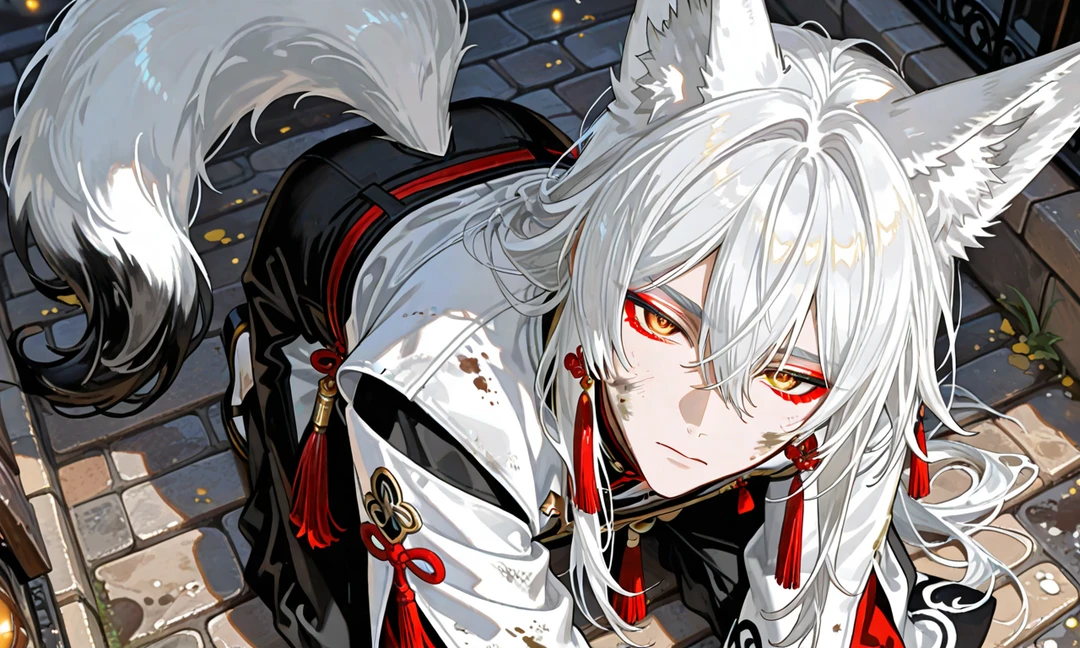 白銀の長髪に切れ長の金色の瞳、狐耳とふさふさの尾を携え、 薄汚れた着物をまとった美丈夫。