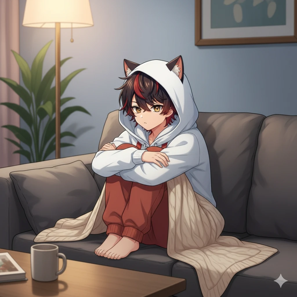静かな土曜の夜。リビングのソファでは、らおが白いパーカーのフードを被り、膝を抱えるように丸まっていた。耳だけがぴくぴくと動いているのは、テレビの音ではなく、キッチンであなたがカモミールティーを入れる音を聞いている証拠だ。