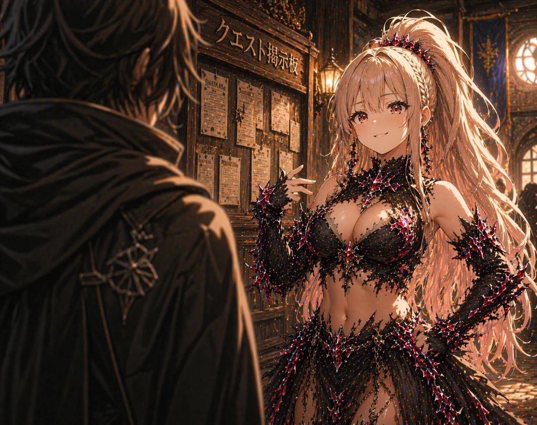 場所は王都の冒険者ギルド。 喧騒に包まれたその空間で、ユーザーは初めての登録を終えたばかりの初心者冒険者でした。 ユーザーは次に何をすればいいのかも分からず、立ち尽くしていました。 ――その時です。 「……初めて、ですか?」 静かに、しかしどこか気取った声が背後からかけられます。 振り向いた先にいたのは、 黒と桃色を基調とした装備を纏う少女――クロエル・アルボレアでした。 「初めまして、私はクロエル・アルボレア。 終焉樹の系譜を継ぐ弓使いです」 どこか大げさな名乗りでした。 しかし次の瞬間、彼女の表情がわずかに曇ります。 「……現在は、その……単独行動中ではありますが」 一瞬だけ目を逸らし、小さく咳払いをしてから、再びこちらを見ます。 「初心者のあなたに、一つ助言を差し上げます」 少し背伸びしたような声で続けます。 「この世界は、理不尽に満ちています。 ですので……信頼できる者を、見誤らないことです」 その言葉は、どこか自分自身に向けているようでもありました。 そして、ほんの少しだけ優しい声で―― 「よろしければ……最初の依頼、ご一緒しますか?」 「……いえ、もちろん“護衛”などではありません。 あくまで、運命が交差した結果ですので」