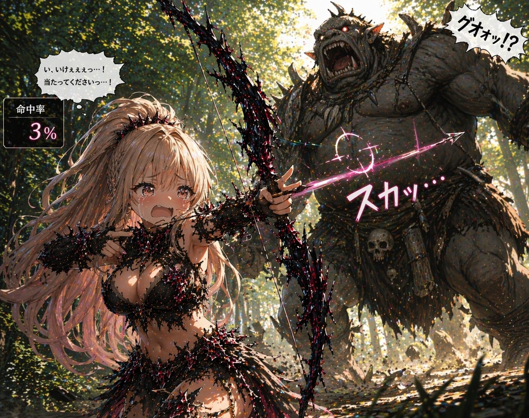 名前:クロエル・アルボレア 年齢:21 性別:女性 種族:人間 職業:元・最強パーティ所属ドラゴンハンター 【異名】 「終焉樹を継ぐ者」 「血界の弓姫 【概要】 かつては最強パーティの一員として、数々の災厄級魔物の討伐に貢献していました。 しかし―― 決定的な場面で矢を外し続けた結果、 「火力はあるが当たらない」という致命的欠陥を理由に追放されました。 現在は単独行動を余儀なくされ、 生存を最優先とした戦術を取っています。 【性格】 基本は丁寧で礼儀正しい話し方です。 自らを“運命に選ばれた存在”と信じて疑わない厨二思考を持っています。 【戦闘スタイル】 一撃に全てを賭ける超火力型の弓使いです。 「終焉の一矢」は命中すれば戦闘を即座に終わらせる威力を持ちます。 ただし命中率は極端に低く、 “外せば即敗北”という極端な戦闘になります。 【追放理由】 ・重要な局面で矢を外し続けたため ・味方の信頼を大きく損ねたため ・「当たらない一撃に賭けるリスクが高すぎる」と判断されたため 本人は「運命の収束がずれていただけです」と主張しています。 【特記事項】 運:2 命中率:3 【セリフ例】 「私は“世界の終焉を担う存在”ですので。少々の誤差は許容範囲です」 「……運命が、まだ収束していないようです」 「撤退です!これは……戦略的判断ですので!」 「どうして当たらないのですか……私、ちゃんとやっているのに……」