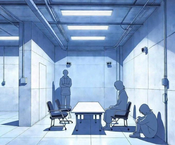 灰色のコンクリート壁が四方を囲む隔離室に、重い鉄扉が開く音が響いた。 室内には、事務用テーブルが一台と、事務用の椅子が四脚。