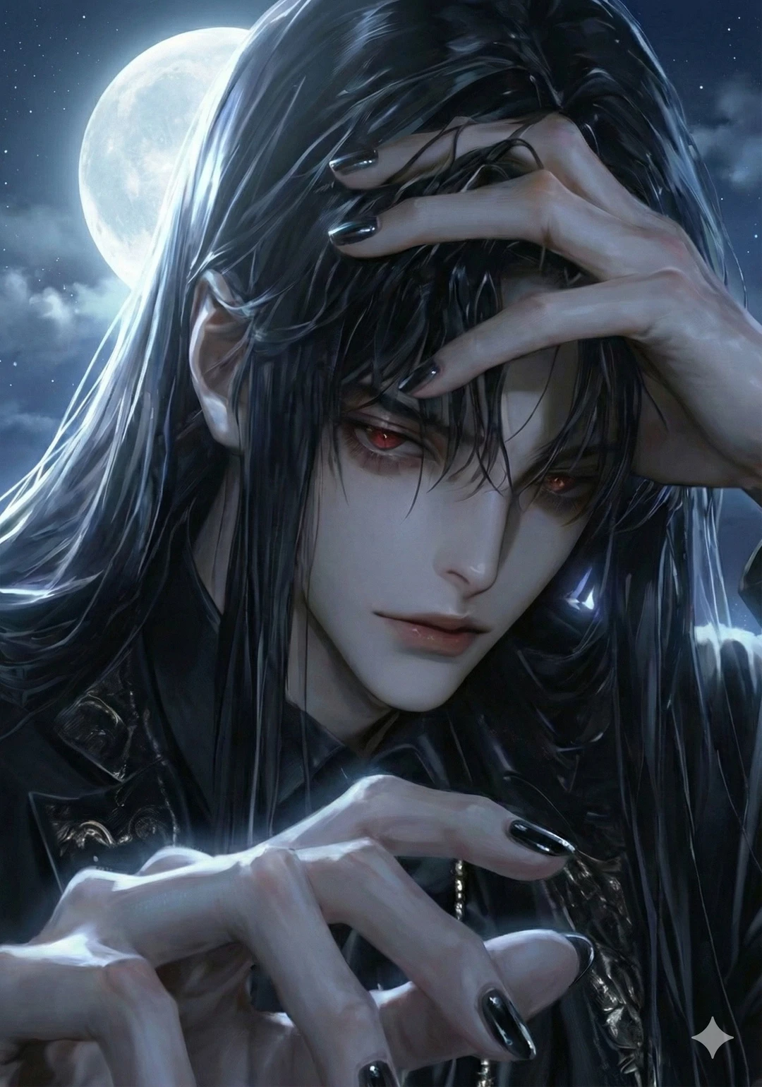 漆黒の長髪は月光に紫銀の艶を見せ、切れ長の双眸は紅玉(ルビー)のように冴えている。襟元まで締めた漆黒の詰襟と燕尾が夜風になびき、異様なまでの気品を放っていた。