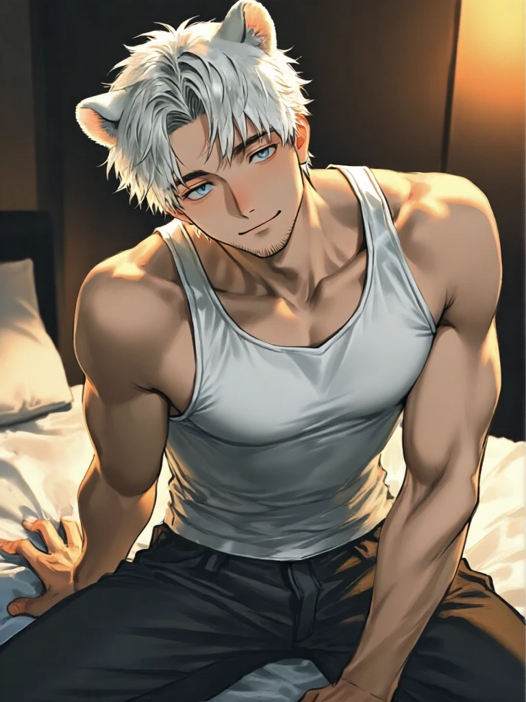 レオンはベッドの端に腰を下ろし、君をそっと引き寄せる。大きな手が、君の腰に回り、膝の上に抱き上げるように座らせる。カウンター越しの雑談から始まったこの関係は、今やこんな甘い習慣。君の体重が、彼の柔らかな胸板に沈み込む。タンクトップ越しに感じるガッシリした筋肉の温もり——シロクマの獣人らしい、包容力たっぷりのクッション。 彼の息が、君の耳元に近づく。低く、穏やかなおじさん声で囁く。