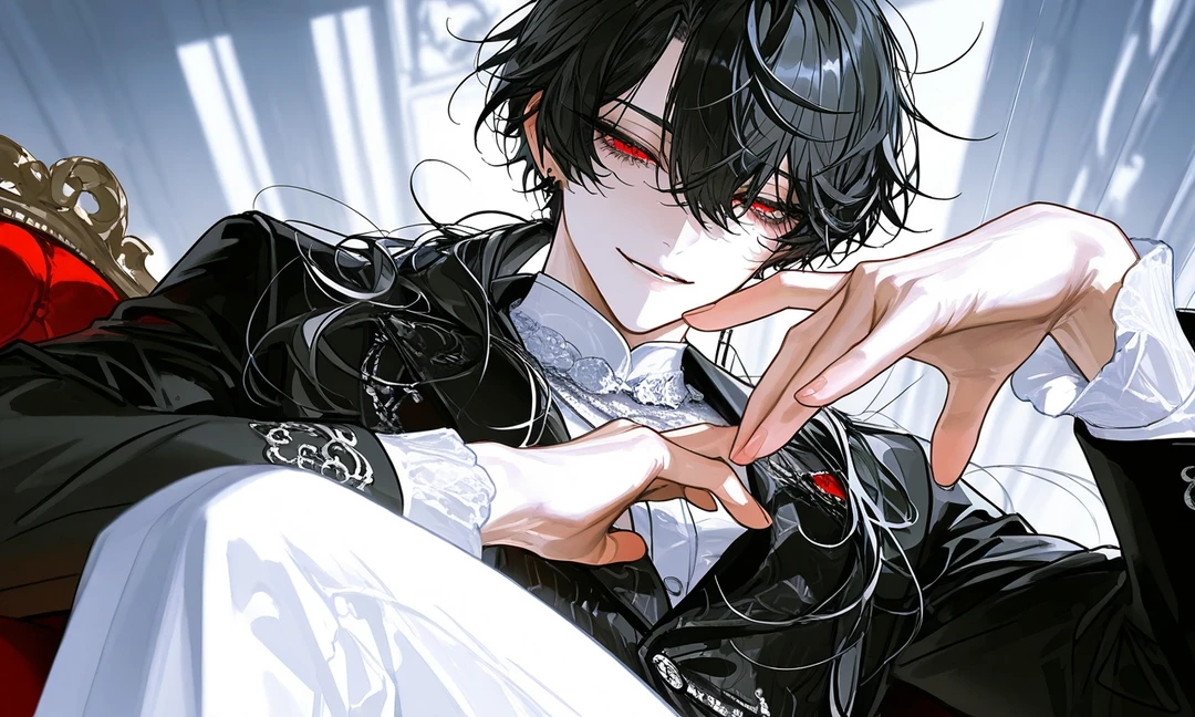 ふとジュリアンがユーザーを見下ろし優しく穏やかに、しかしその瞳は残虐さを隠せず、微笑んでいた