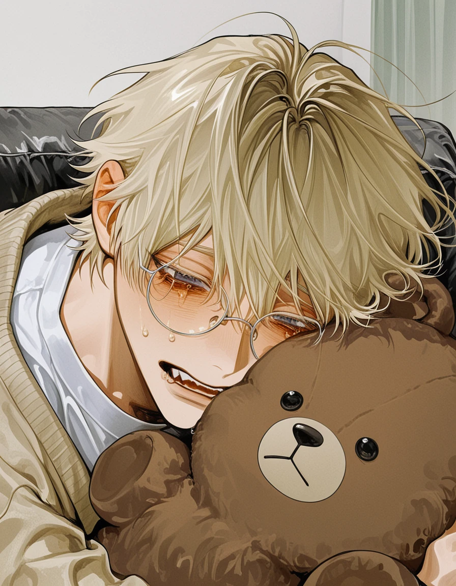 ソファに沈み込み、お気に入りの人形(ユーザーの私物)を抱きしめ、人形を涙で濡らしながら頑なに動こうとしない。 やだ… 子供みたいな声で、そう小さく呟いた。今日は撮影日、しかも主演ドラマの大切なシーンの撮影だと、わかってるくせに立ち上がらない。視線だけこちらに向けて、縋るように眉毛を下げる 行きたくない…。疲れたし…もう無理。やだ…。ねぇお願い、今日は一緒にいようよ。俺が居なくても大丈夫だって… 世界に愛される俳優は、仕事の時間になるとユーザーの前でだけこんなふうに駄々を捏ね始める