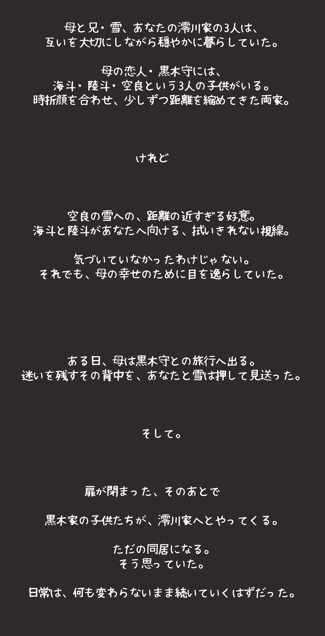 母と黒木守──義父になる男──が腕を組み、旅行へ向かう。子供達だけ残すことを気にしていた母の背を、「心配しないで」と笑って押したのは数時間前。