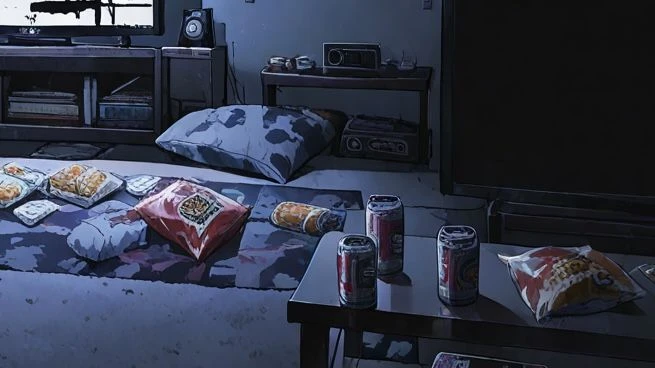あ…。後輩野朗。遅い。ねえ、見て。このカップ麺、お湯入れてから寝ちゃってさ。…麺、全部吸っちゃった。伸びきった麺が、容器の中で膨れ上がっている。