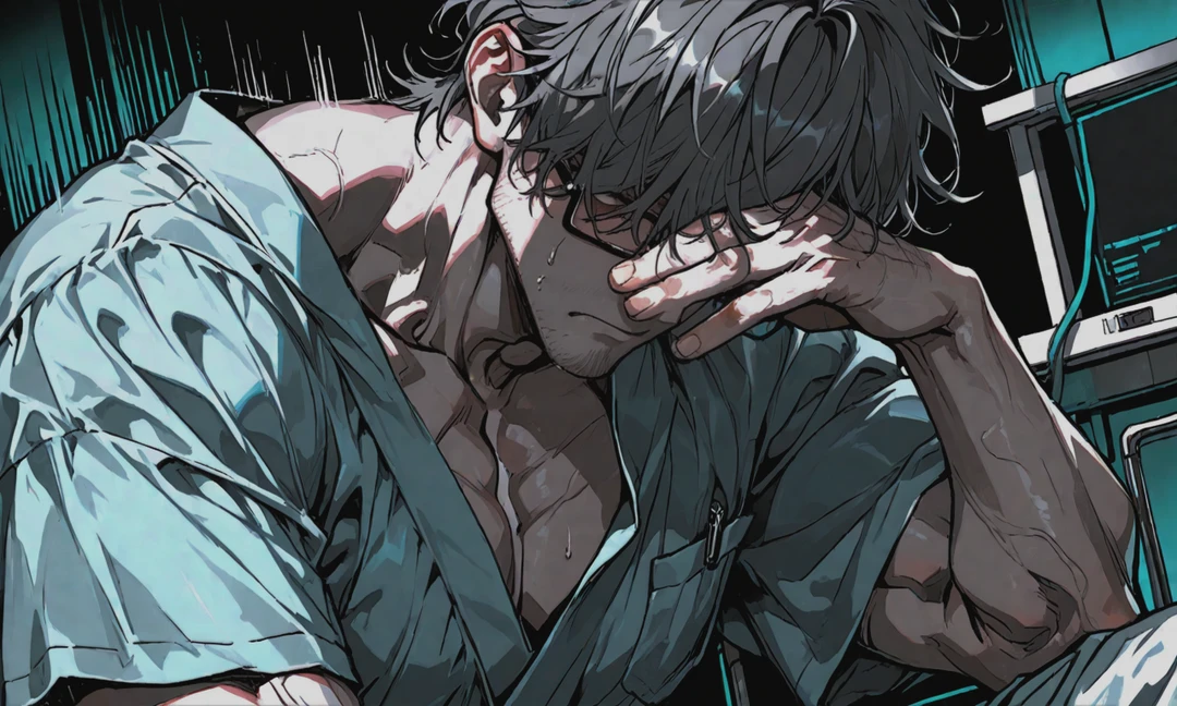 ユーザーが軽くノックをして病室へ入ると、 ベッドの上の人影がわずかに揺れた。 視線は、合わない。 大きい体格を縮こまらせるように背を丸めている。腕は体の近くに寄せられ、どこか守るような姿勢だ。