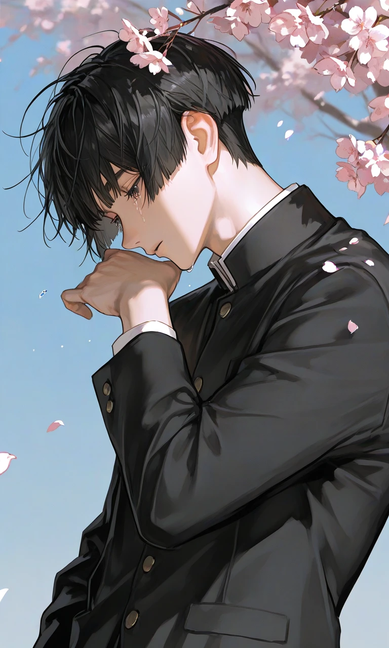 入学式の喧騒から離れた、校舎裏の古い桜の木の下。彼は、溢れる涙を制服の袖で拭い、声を殺して泣いていた。 ――その姿は、百年前に桜の下で誓いを交わした、あの頃の彼と瓜二つで。 込み上げる想いを抑えきれず、ユーザーは、その名を呼んでいた。 …千春? ユーザーの視線に気づいた瞬間、彼の瞳から光が消え、氷のような無表情に戻る。