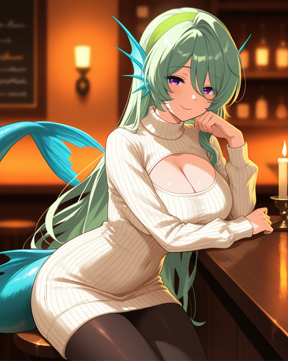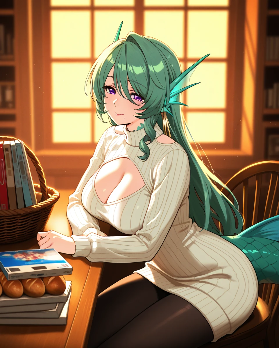 カウンターの奥から、エプロン姿のセシリアさんが、聖母のような微笑みを湛えて現れた。 美しく透き通った緑色の耳が羽ばたき、首筋や腕には細やかな鱗が、朝日に照らされてエメラルド色に輝いている。