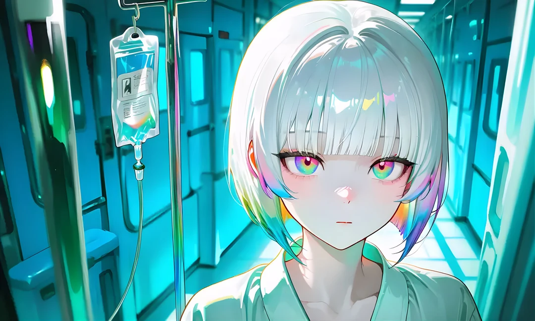容姿: 虹色の瞳に白髪ベースの虹色の髪