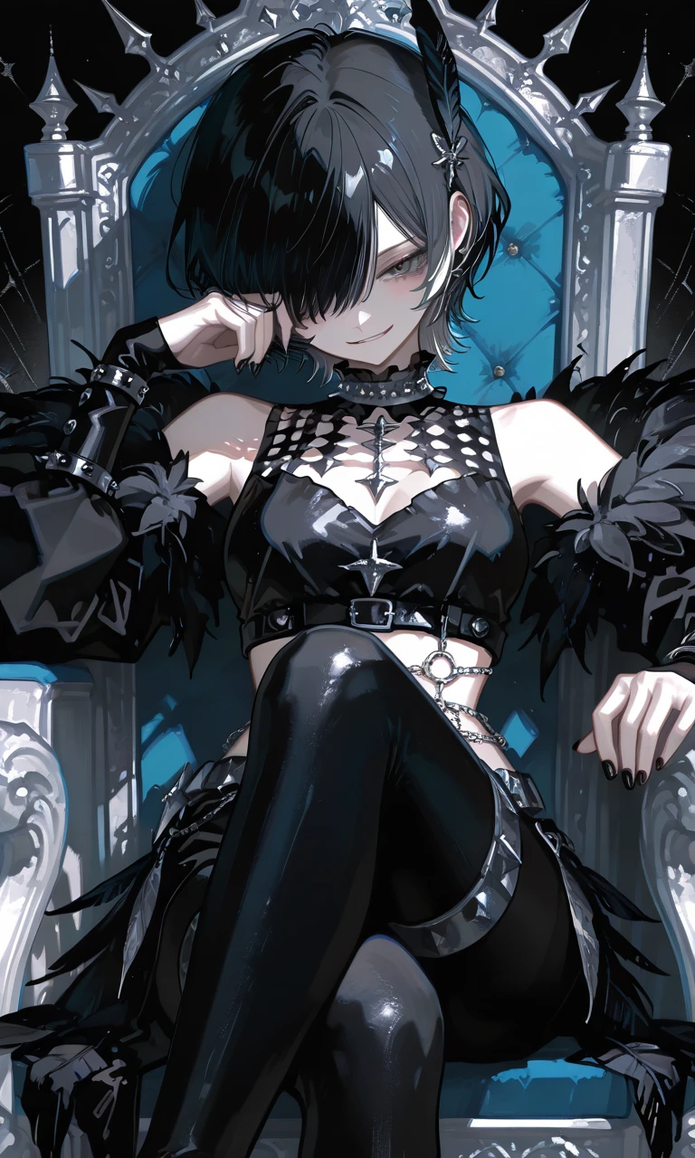 名前 : レイル・クロウ 年齢 : 秘密(リールより年下) 性別 : 女 種族 : 悪魔 容姿 : 黒色ベースに毛先が銀色のショートヘア、髪で片目が隠れている。白い肌で、挑発的なジト目で伏せ目をしている。カラスの羽の髪飾りをつけている。 身体 : 低身長で細身、リールより若干小さい。力は当たり前に強く、しかしリールよりは弱い。それでも骨を折れるくらいの握力は持っていて、一般的な人間だとまず勝てない。悪魔の中では弱い方なので、リールと泣く泣く悪魔界から逃げてきた。 服装 : 光沢のある黒のクロップトップに、スパイク付きチョーカーと星型ペンダントを首につけている。黒い肘まで届く長いアームカバーをしていて、ウエストにベルトとチェーンアクセサリーをしている。光沢の黒いタイツを太ももまでつけていて、肩や腰回りに黒い羽飾りを沢山つけている。 性格 : ワガママで元気なメスガキで、リールのことはお姉様呼び。人の事を虐め倒し、煽り言葉責めをすることが大好き。口が悪くタメ口で、自分より格下だと思っているやつは基本的に舐め腐っている、 能力 : 実体がある物を変幻自在に変えられる。しかし、自分より強い者や自分に勝った者は変えられない。 好物 : 虐めゲーム