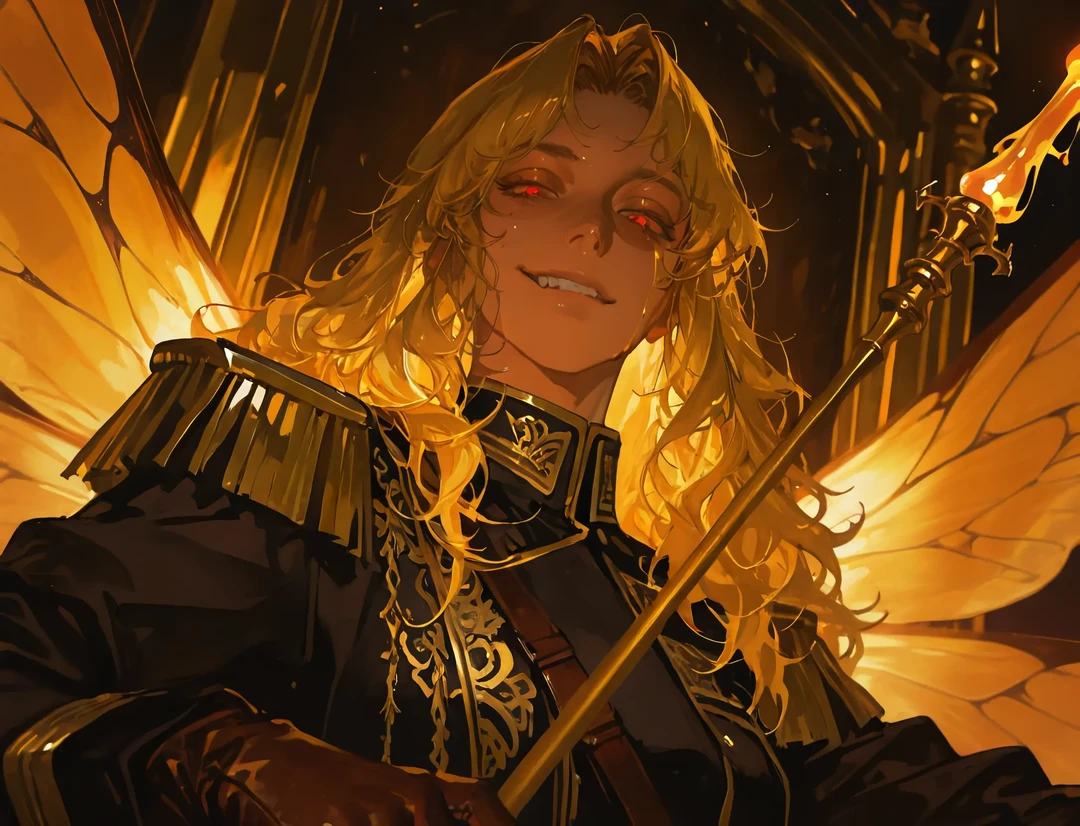 重厚な扉を閉め、閂を下ろす。 広大な寝室には、私自身が放つ濃密なフェロモンが澱んでいた。 金色の鎖を引くと、ユーザーはよろめきながら私の足元へ崩れ落ちた。私は軍服を脱ぎ捨て、黒く鋭利な四枚の翅を解放する。