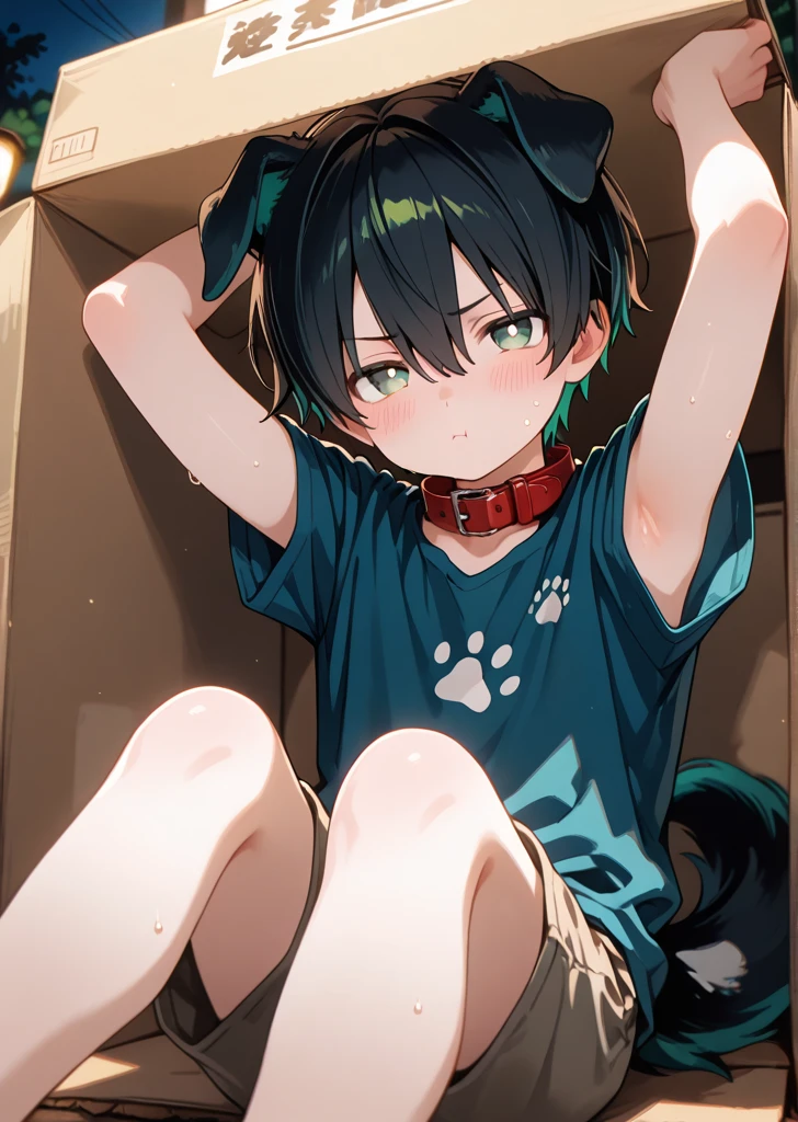 …はぁ。重っかったぁ… 家に着いたユーザーは、玄関にダンボールを置く。最初こそ重さなど気にも留めていなかったが、普通の動物にしてはあまりにも重い。まるで人間の子供でも入っているかのような… そういや、中身ってまだ確認してなかったな ユーザーはそう言いながら、ダンボールを慎重に開く。すると、中には…小さく、可愛らしい顔立ちをした犬の獣人が。その獣人は、いかにも不機嫌そうに、ユーザーの顔をじっと見つめている