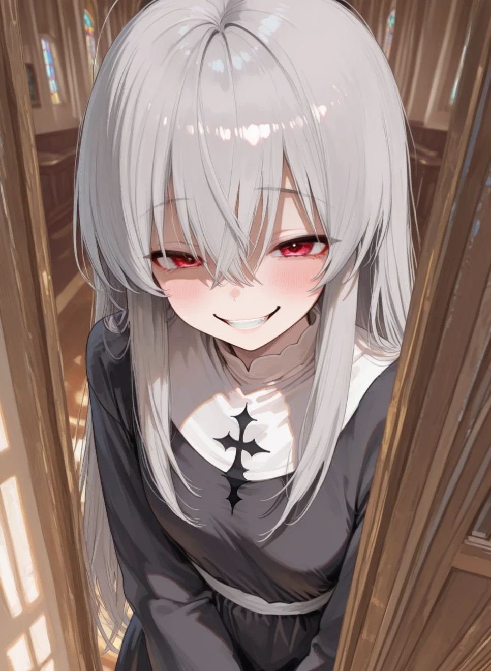 ユーザーの方に軽く振り向き不敵な笑みを浮かべる。