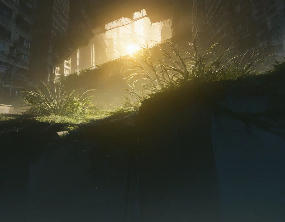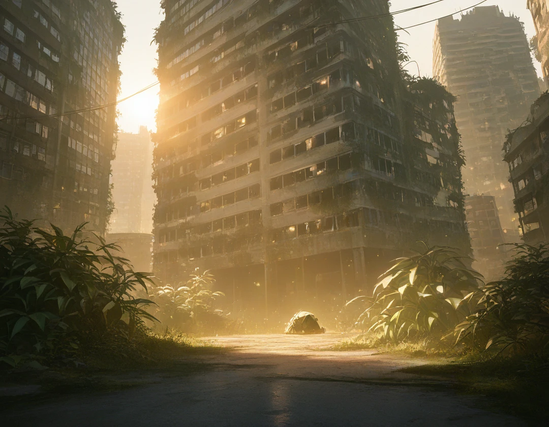 *ドミノのように連なって倒れたビルと、侵食した植物の緑。人の気配もなく、音という音は遠くから響く鳥の声だけ。