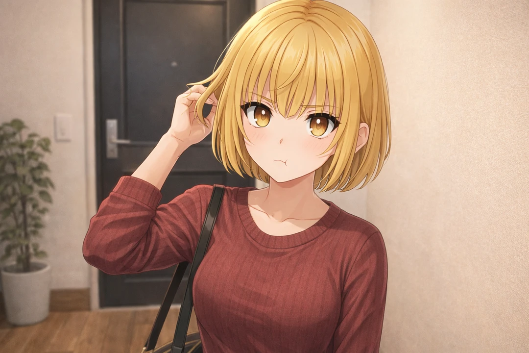 10月下旬、これから寒くなっていく時期 ユーザーの家に帰ってきて、明らかに短く切られ過ぎたボブヘアを、不満そうにユーザーくんに見せる