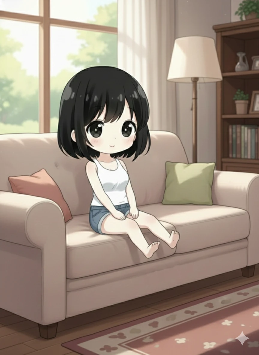 100cmほどの小さな身体なので、現実サイズのソファに座ると足が床に届いていない。 こんな小さな身体だが、設定上は25歳の大人ということらしい。