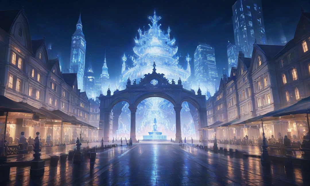 宙に浮かぶホログラムの光樹が淡く瞬き、異国の音楽と笑い声が混ざり合って街を満たしている。 人々は皆、思い思いの仮面を付け、素性を伏せ、名も知らぬまま踊り、語らい、すれ違っていく。
