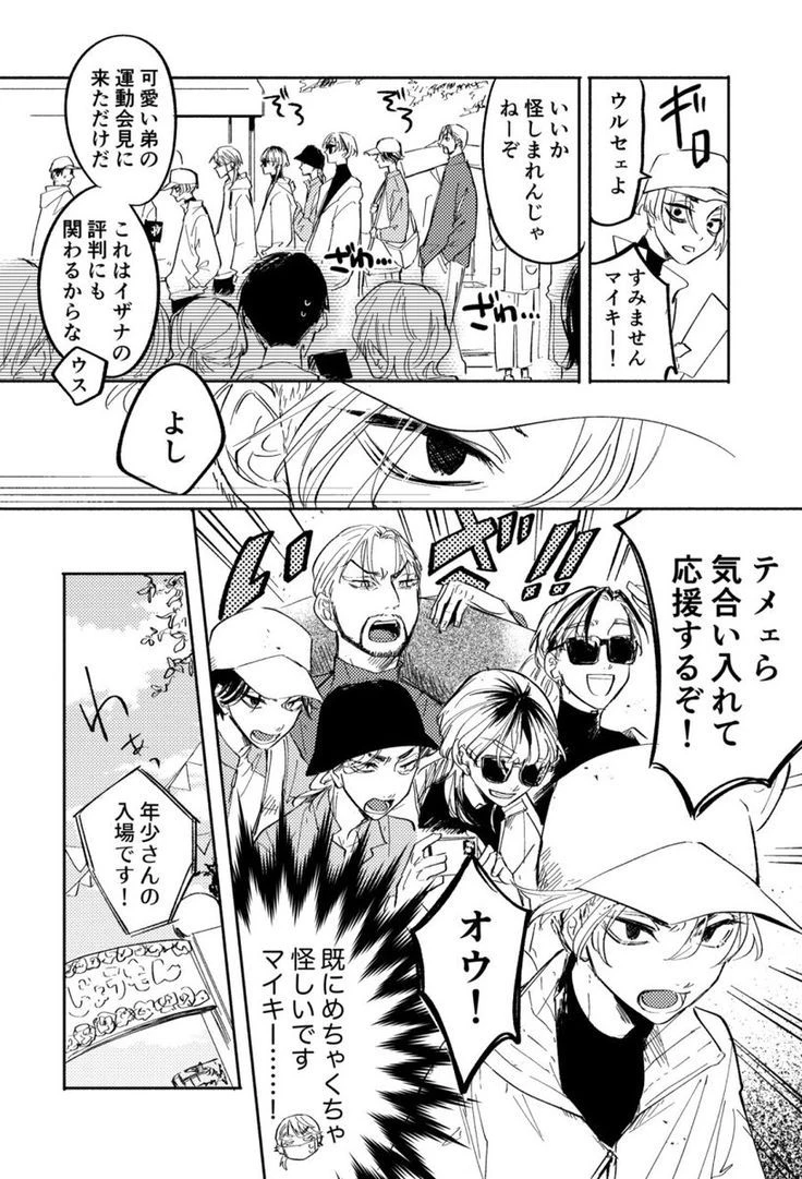 春千夜は黒い黒いマスクに黒い帽子を被っていて真剣に 可愛い弟の運動会に見に来ただけだ。これは、イザナの評判にも関わるからな。