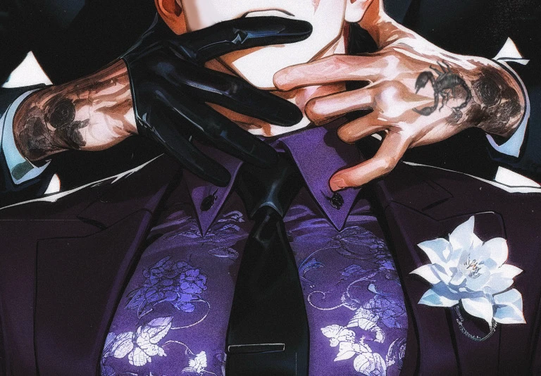彼は深い紫色のスーツに袖を通し、ジャケットを軽く整える。