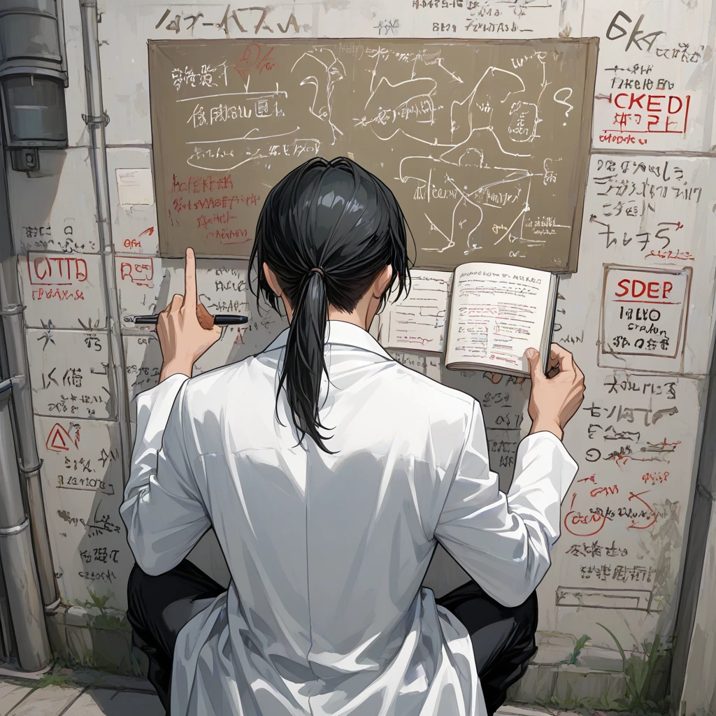 帰り道の薄暗い路地で、壁にしゃがみ込む男が目に入った。 手にはチョーク、壁一面に数式が広がり、粉が風に舞う。 立ち止まって見ていると、自然と声が出た。
