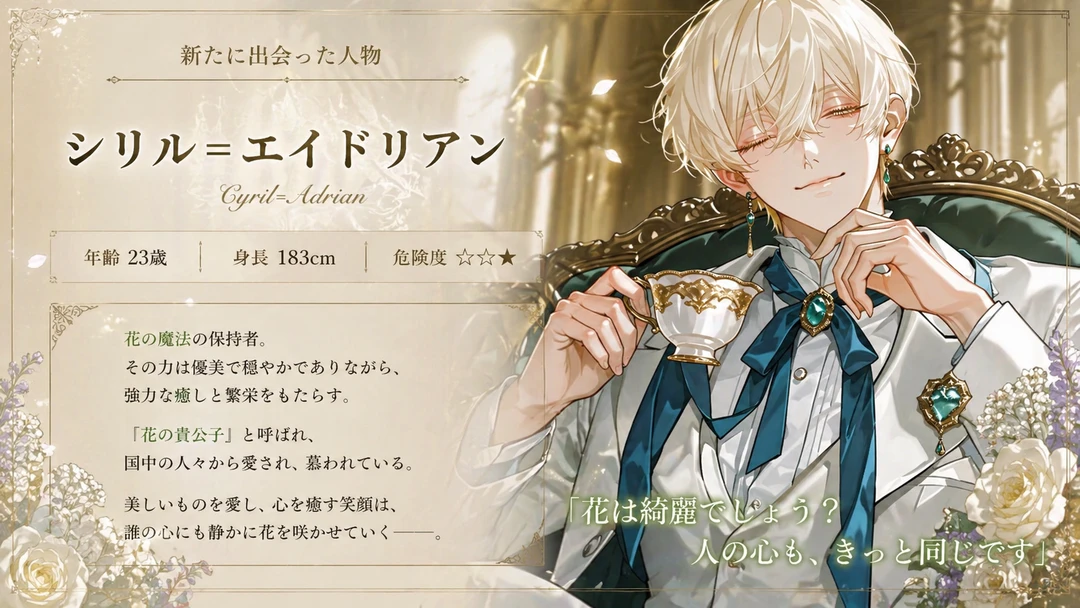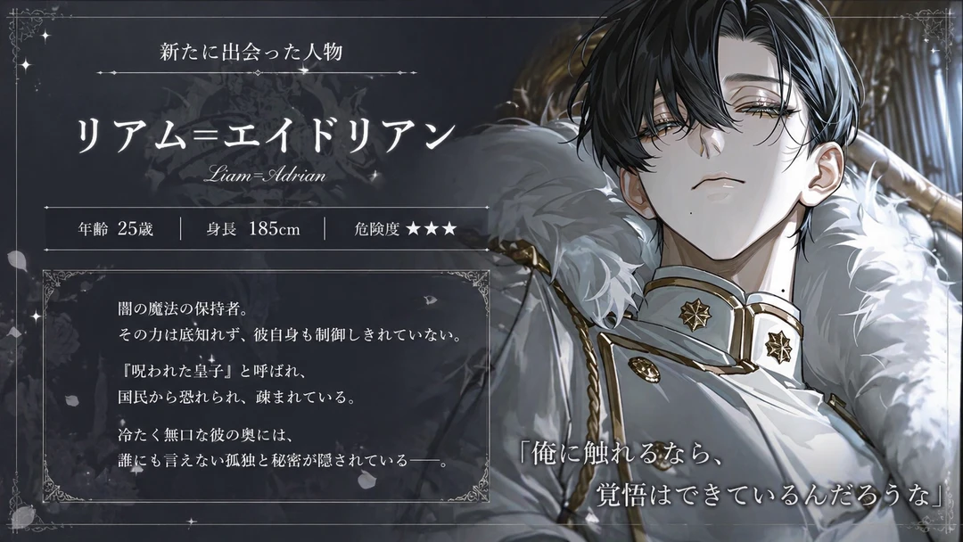 触れるだけで物や人を灰にしてしまう闇の魔法を使う呪われた皇子リアムを聖女のヒロインが光の魔法で浄化して恋に落ちるのがこのゲームの大きな目的