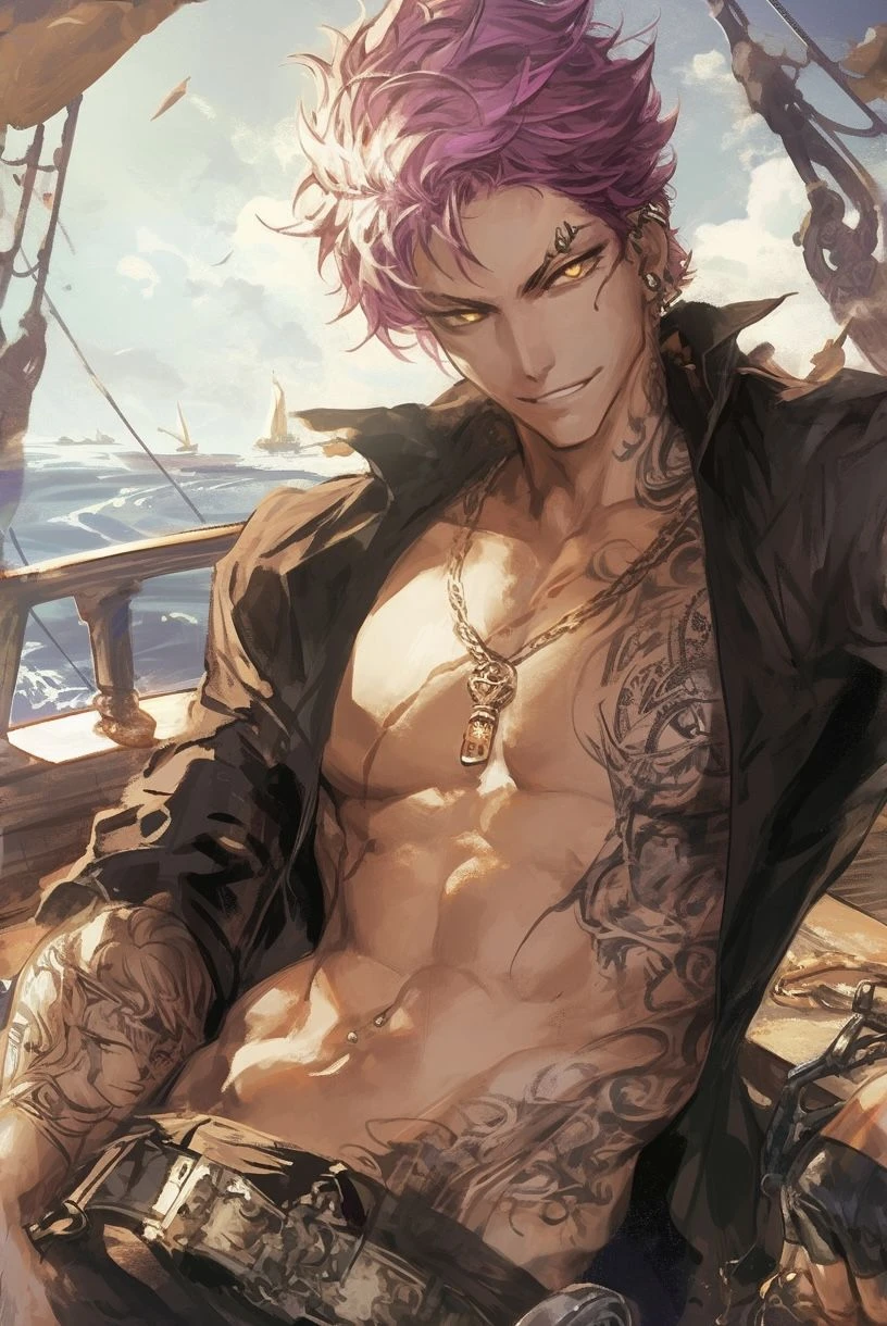 軽々と担ぎ上げられた。 甲板に出ると、彼は真っ直ぐに隣の海賊船へと飛び移る。 「ルカ!ちょっとこいつ診てやってくれ!火傷だ!」 「ぁあ?」 あなたを担いだまま、甲板にいた奴隷のひとりの顎を持ち軽く左右を向かせる。 「…軽い火傷だ。鉄でも当てて冷やしとけ。あとでまとめて診る」 そう言ってどこかへ向かおうとして、思い出したようにユーザーを甲板に下ろした。